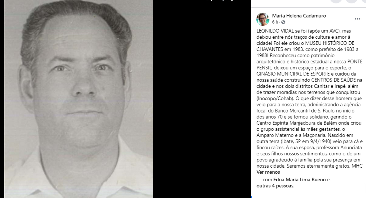 "LEONILDO VIDAL se foi (após um AVC), mas deixou entre nós traços de cultura e amor à cidade! Foi ele criou o MUSEU HISTÓRICO DE CHAVANTES em 1983, como prefeito de 1983 a 1988! Reconheceu como patrimônio arquitetônico e histórico estadual a nossa PONTE PÊNSIL, deixou um espaço para o esporte, o GINÁSIO MUNICIPAL DE ESPORTE e cuidou da nossa saúde construindo CENTROS DE SAÚDE na cidade e nos dois distritos Canitar e Irapé, além de trazer moradias nos terrenos que conquistou (Inocopo/Cohab). O que dizer desse homem que veio para a nossa terra, administrando a agência local do Banco Mercantil de S. Paulo no início dos anos 70 e se tornou solidário, gerindo o Centro Espírita Manjedoura de Belém onde criou o grupo assistencial às mães gestantes, o Amparo Materno e a Maçonaria. Nascido em outra terra (Ibate, SP em 9/4/1940) veio para cá e fincou raízes. À sua esposa, professora Anunciata e seus filhos nossos sentimentos, como o de um povo agradecido à família pela sua presença em nossa cidade. Seremos eternamente gratos. MHC".