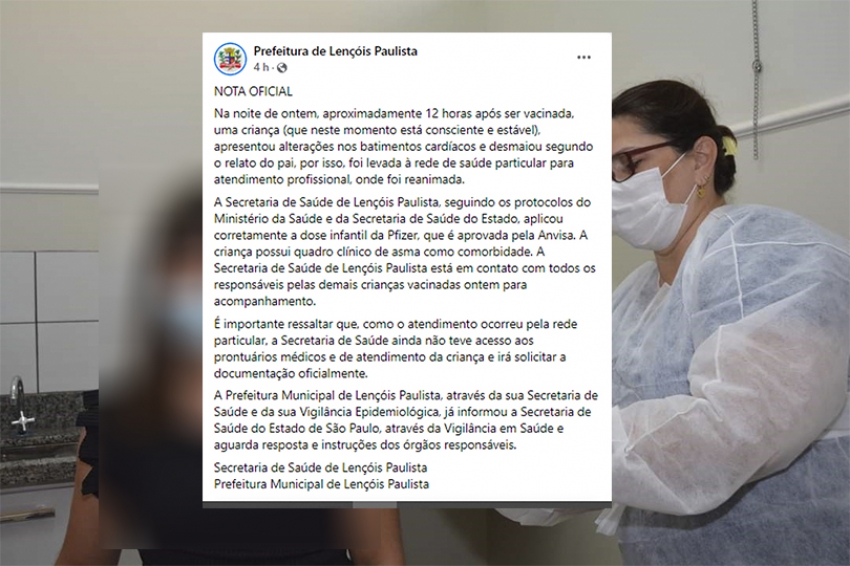 A Prefeitura de Lençóis Paulista (152 km de Ourinhos) publicou, no fim da tarde desta quarta-feira, 19, uma nota, avisando que suspendeu, por 7 dias, a vacinação de crianças, após uma menina de 10 anos sofrer parada cardíaca, depois que tomou a vacina. A decisão foi tomada por um comitê. Confira a nota: