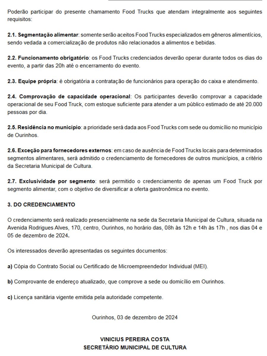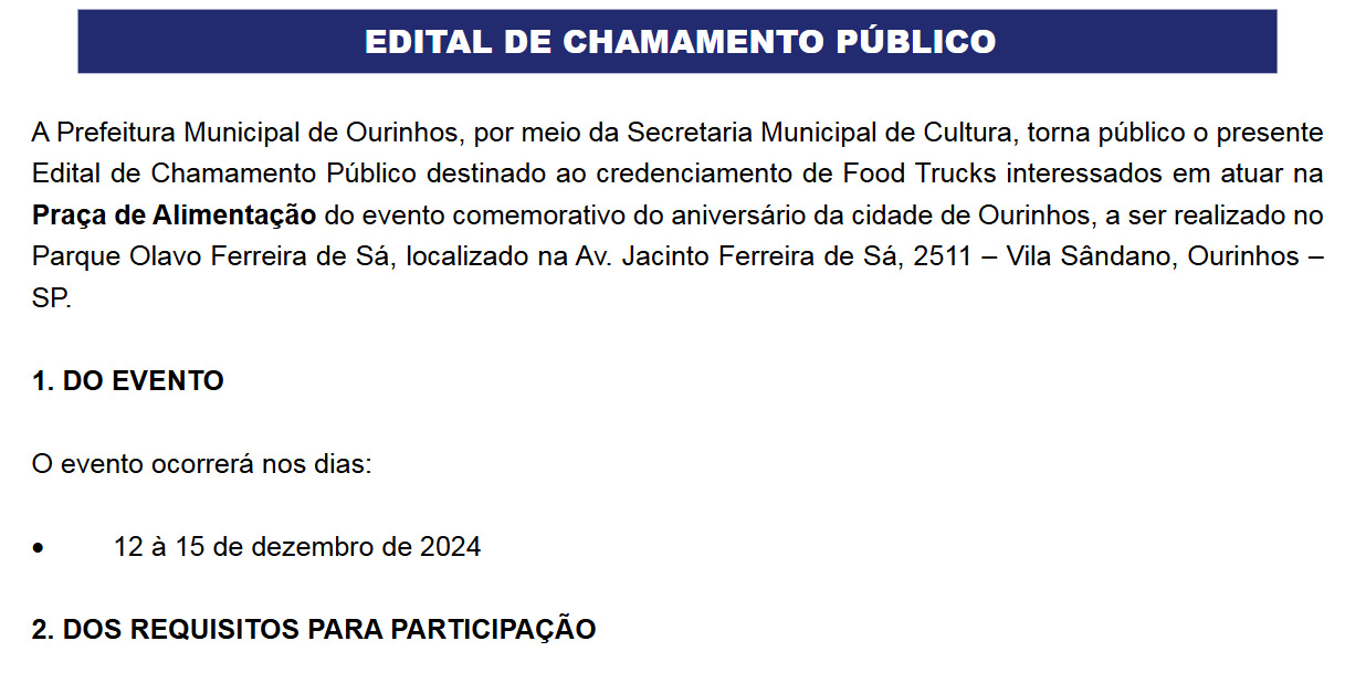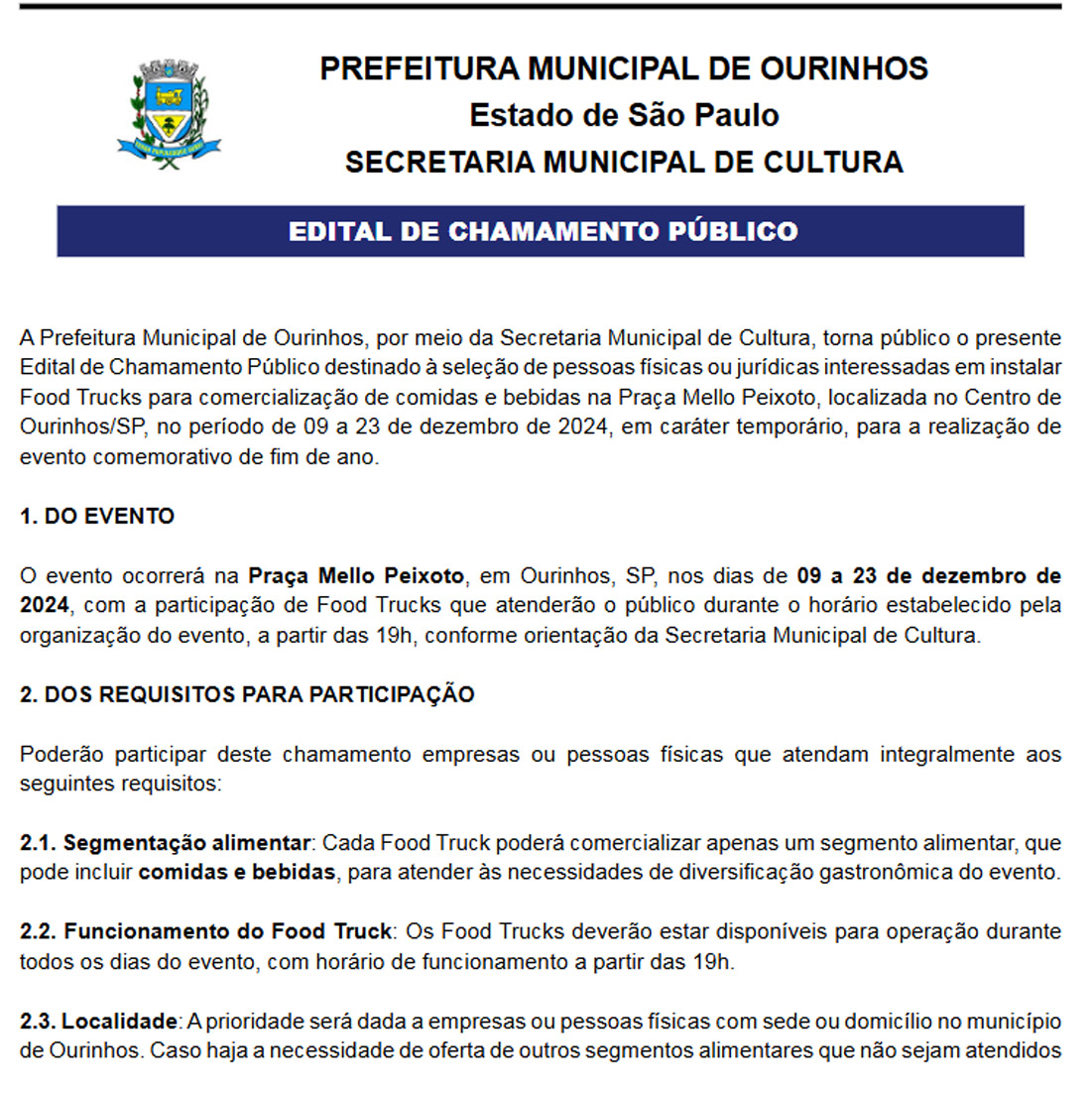 A Prefeitura de Ourinhos, por meio da Secretaria Municipal de Cultura, divulgou dois editais de Chamamento Público para a seleção de Food Trucks que atuarão na comercialização de comidas e bebidas durante os eventos de fim de ano e aniversário da cidade.