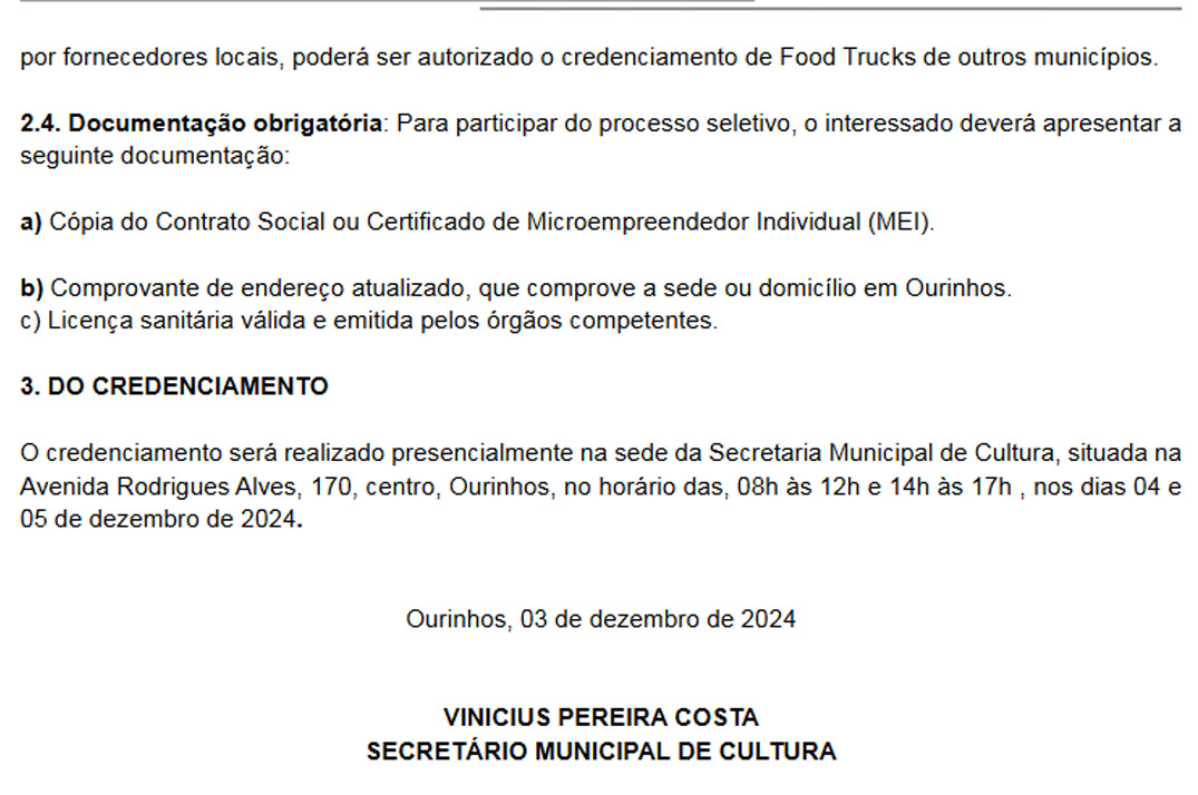 Os interessados podem se credenciar presencialmente na Secretaria de Cultura, localizada na Avenida Rodrigues Alves, 170, no centro de Ourinhos, nos dias 4 e 5 de dezembro de 2024, das 8h às 12h e das 14h às 17h.