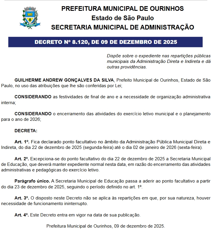 Além do pagamento antecipado, a Prefeitura publicou nesta terça-feira (9), no Diário Oficial, o Decreto nº 8.120, que estabelece o recesso de fim de ano nas repartições públicas municipais. O ponto facultativo será adotado entre 22 de dezembro de 2025 e 2 de janeiro de 2026 para toda a administração direta e indireta.