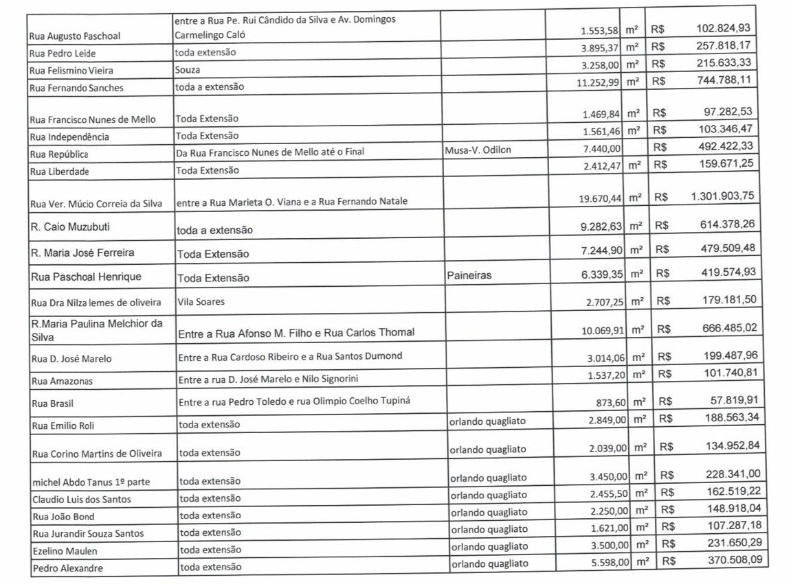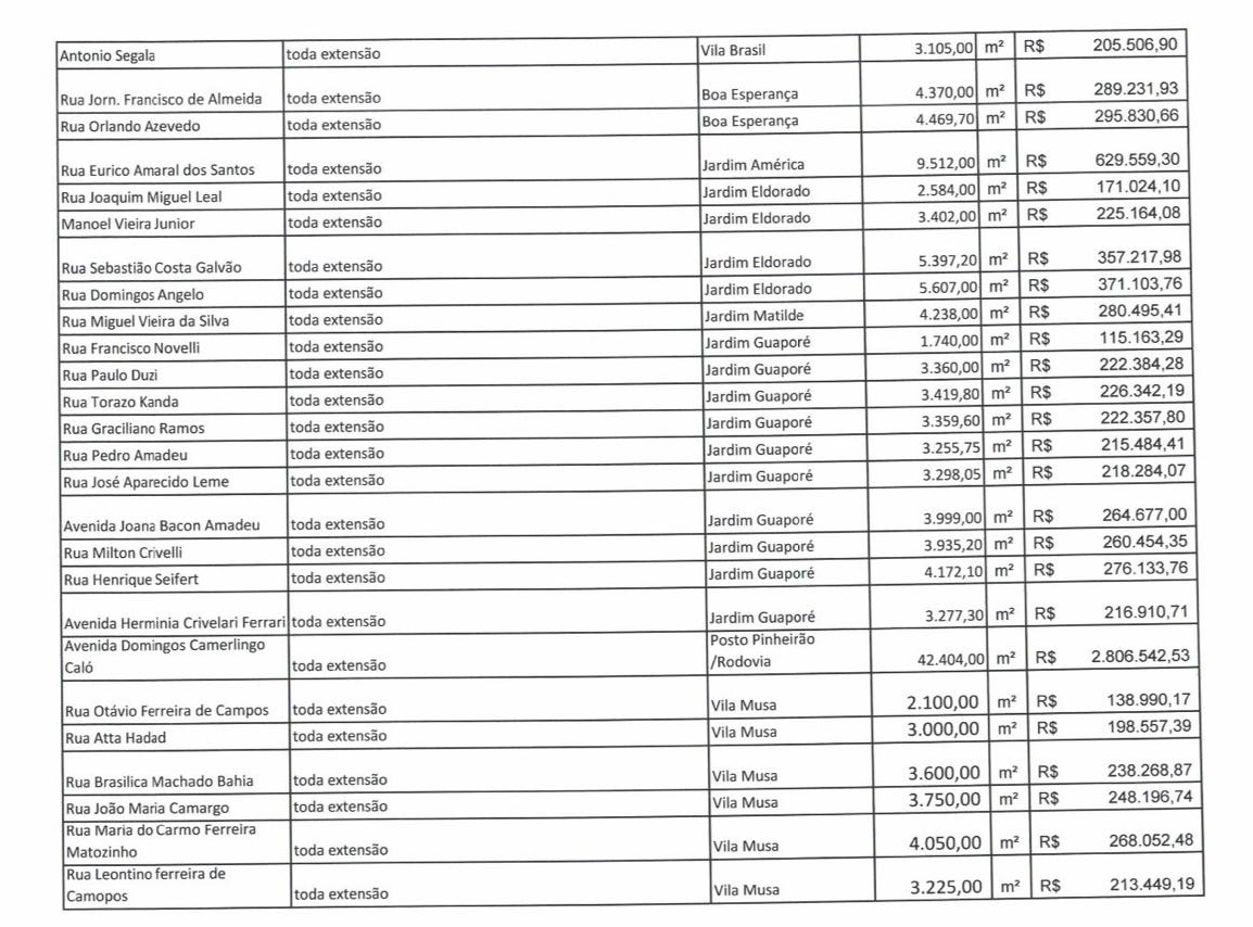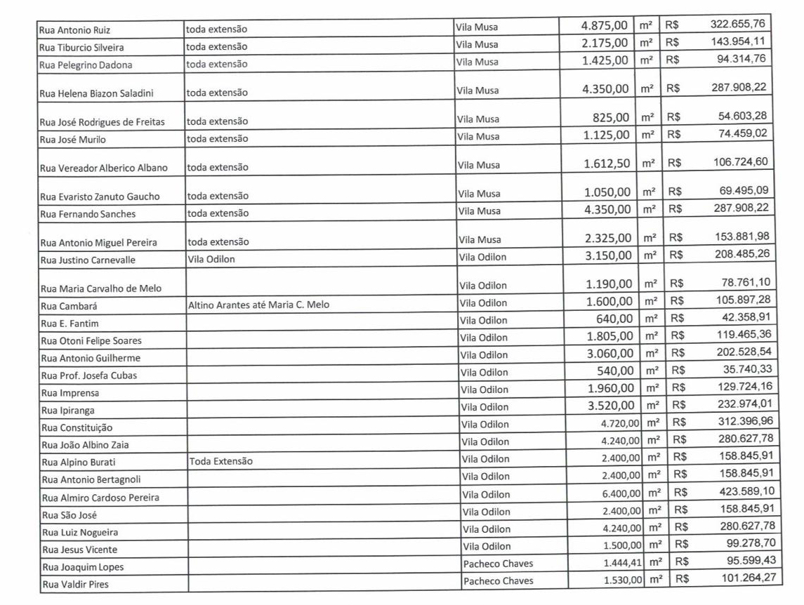 A Prefeitura de Ourinhos está prestes a iniciar um dos maiores programas de recapeamento asfáltico da história da cidade, que abrangerá mais de 100 ruas distribuídas em 12 bairros. O investimento, que ultrapassa R$ 35 milhões, visa melhorar significativamente a qualidade das vias nos bairros Vila Musa, Orlando Quagliato, Paineiras, Helena Braz Vendramini, Jardim Anchieta, CDHU, Vila Brasil, Boa Esperança, Jardim América, Jardim Guaporé, Vila Odilon e Parque Pacheco Chaves. Veja a relação abaixo.