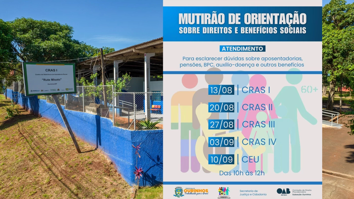 O atendimento será realizado sempre às quartas-feiras, das 10h às 12h, com início no CRAS I, localizado na Vila São Luiz. A ação tem como objetivo oferecer informações e esclarecimentos sobre aposentadorias, pensões, BPC (Benefício de Prestação Continuada), auxílio-doença e outros direitos e benefícios sociais.