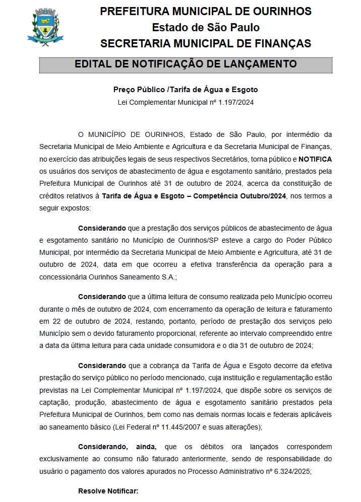 A Prefeitura de Ourinhos anunciou que fará a cobrança de uma tarifa de água e esgoto referente ao mês de outubro de 2024, período em que ainda administrava o sistema antes da transferência para a concessionária Ourinhos Saneamento. O comunicado foi publicado em edital no Diário Oficial do Município desta terça-feira, 19.