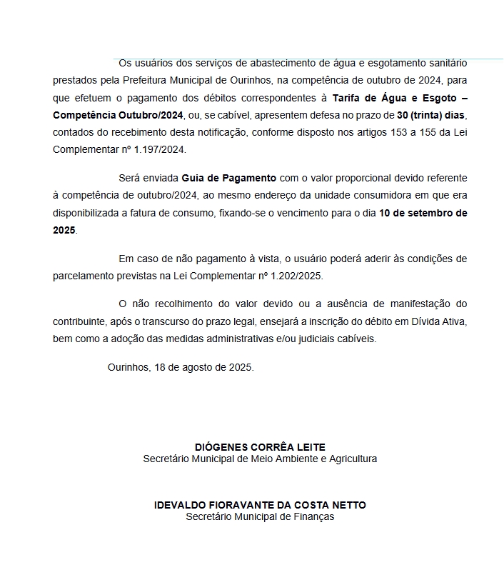 As guias de pagamento, com vencimento em 10 de setembro de 2025, já foram enviadas pelos Correios aos endereços dos consumidores. A segunda via pode ser emitida pelo site https://saeourinhos.hydrus.pro/, mediante o número da unidade consumidora disponível em faturas antigas.