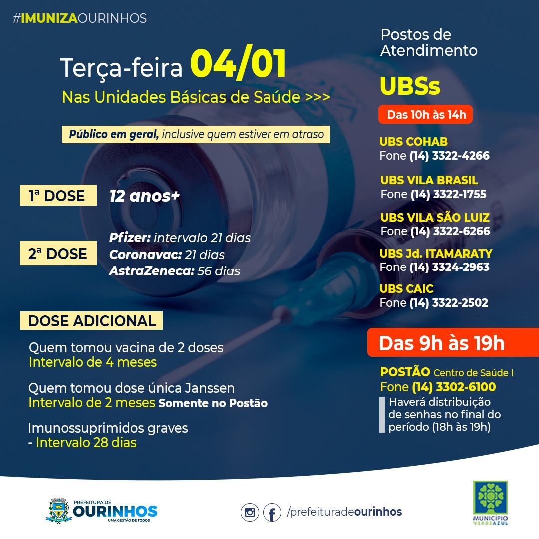 A Secretaria Municipal de Saúde de Ourinhos registrou 106 novos casos de COVID-19 entre os dias 27/12/2021 a 02/01/2022.