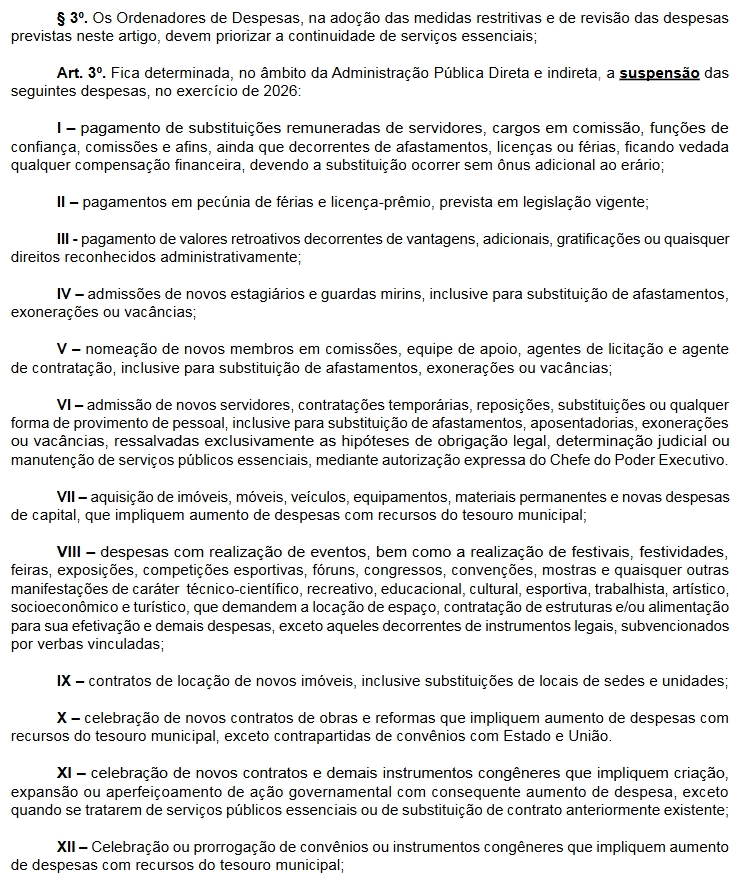 - Eventos: Fica proibida a realização de festas, festivais, exposições ou competições esportivas que demandem gastos do tesouro municipal com locação de espaço ou estruturas.