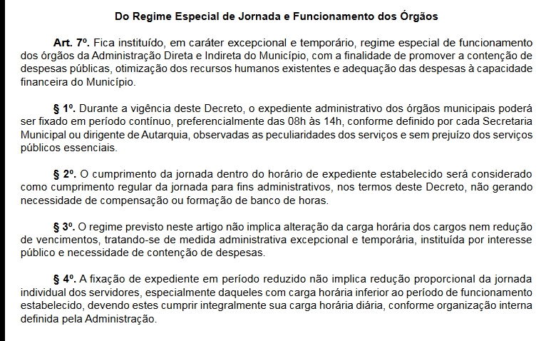 - Horas Extras: A realização de jornada extraordinária está proibida. Casos excepcionalíssimos exigirão autorização direta do prefeito e deverão ser compensados com banco de horas, sempre que possível.