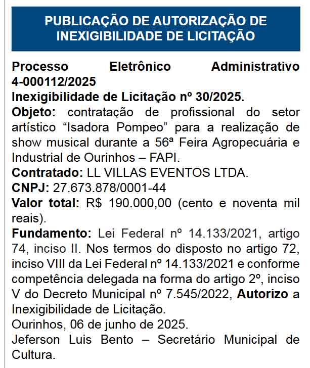 A Prefeitura de Ourinhos publicou, na noite desta sexta-feira, 6, no Diário Oficial do Município, os contratos referentes às atrações artísticas da 56ª edição da Feira Agropecuária e Industrial de Ourinhos (FAPI), que acontece entre os dias 11 e 15 de junho no Recinto Olavo Ferreira de Sá.