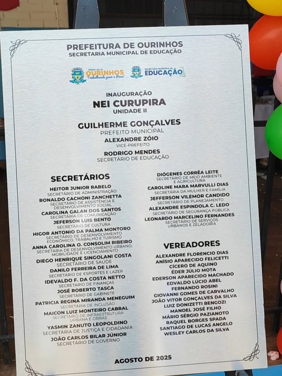 A Prefeitura de Ourinhos celebrou no último sábado, 2, a inauguração da nova unidade do NEI Curupira, agora chamada Curupira 2, instalada na antiga Chácara Kuka Fresca, no bairro Jardim Itamaraty. O espaço, totalmente reformado e ampliado, foi preparado com carinho para receber as crianças da região, em uma ação que representa um avanço importante na oferta de vagas para a educação infantil do município.