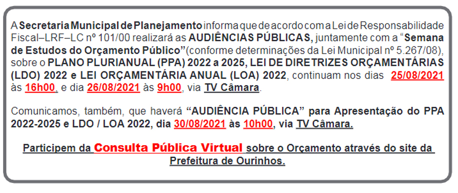 A Prefeitura de Ourinhos iniciou, nesta terça-feira, 24, a realização de audiência públicas, juntamente com a “Semana de Estudos do Orçamento Público” (conforme determinações da Lei Municipal nº 5.267/08), sobre o PLANO PLURIANUAL (PPA) 2022 a 2025, LEI DE DIRETRIZES ORÇAMENTÁRIAS (LDO) 2022 e LEI ORÇAMENTÁRIA ANUAL (LOA) 2022. As audiências ainda continuam nos dias (quarta-feira) 25/08/2021 às 16h, e dia 26/08/2021 às 9h, via TV Câmara.