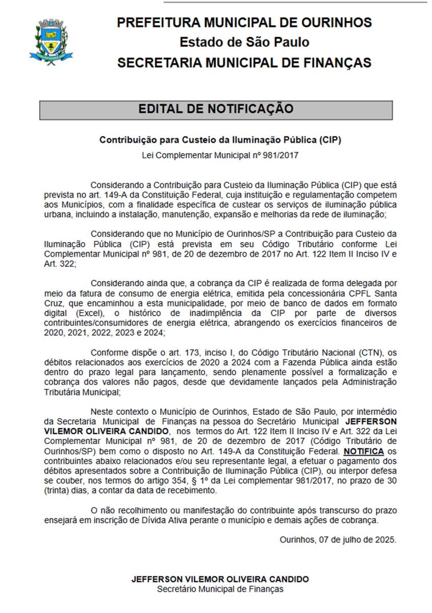 A Prefeitura de Ourinhos publicou nesta sexta-feira, 11, uma notificação oficial aos devedores da Contribuição para Custeio da Iluminação Pública (CIP). A lista com os nomes, endereços e valores devidos dos inadimplentes foi divulgada no Diário Oficial do Município (da página 15 a 27) e abrange débitos referentes aos exercícios de 2020 a 2024.