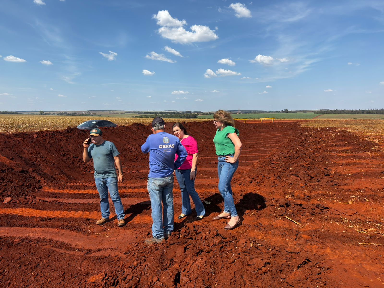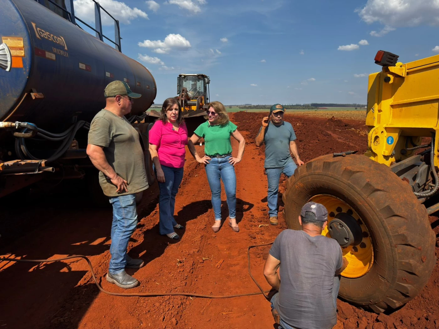 A prefeita Eliana e a vice-prefeita Silvana acompanharam as atividades nos trechos em manutenção. O objetivo, segundo a gestão, é garantir melhores condições de tráfego e segurança para os moradores e produtores que utilizam as vias.