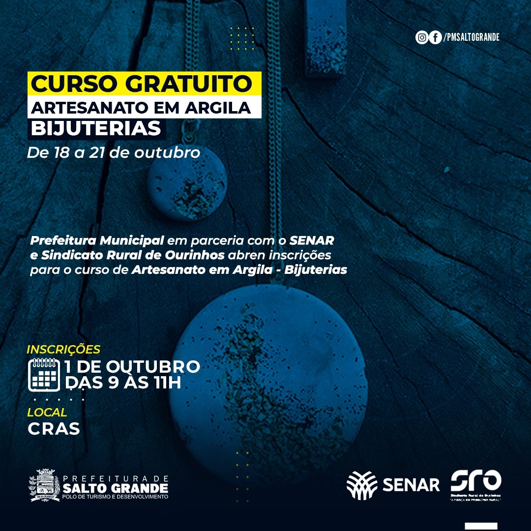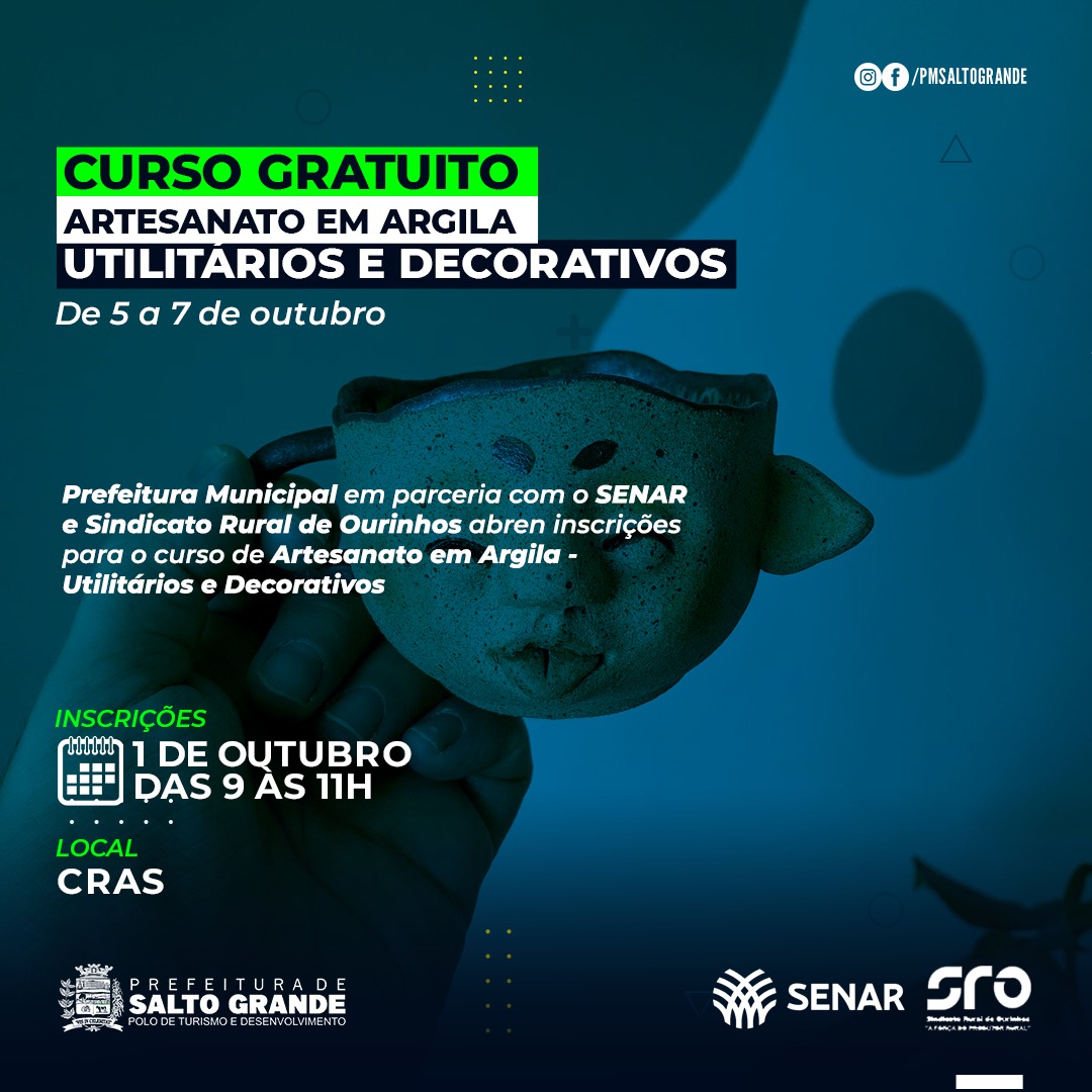 A Prefeitura Municipal, através do Departamento de Assistência Social, em parceria com o SENAR e o Sindicato Rural de Ourinhos, abre inscrição para dois cursos de artesanato em argila. As inscrições deverão ser feitas nesta sexta-feira, 1º de outubro das 9h às 17h. Os interessados deverão comparecer no CRAS (Rua Barão do Rio Branco, 415) munidos com xerox do RG e CPF.