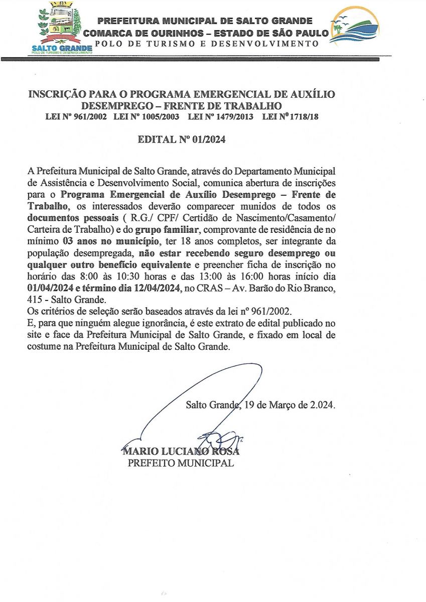 A Prefeitura de Salto Grande anuncia a abertura das inscrições para o Programa Emergencial de Auxílio Desemprego, conhecido como Frente de Trabalho. Criado pela Lei nº 961 em 21 de agosto de 2002, em parceria com o Departamento Municipal de Assistência e Desenvolvimento Social, este programa visa oferecer uma bolsa auxílio desemprego para os qualificados, seguindo critérios específicos de classificação.