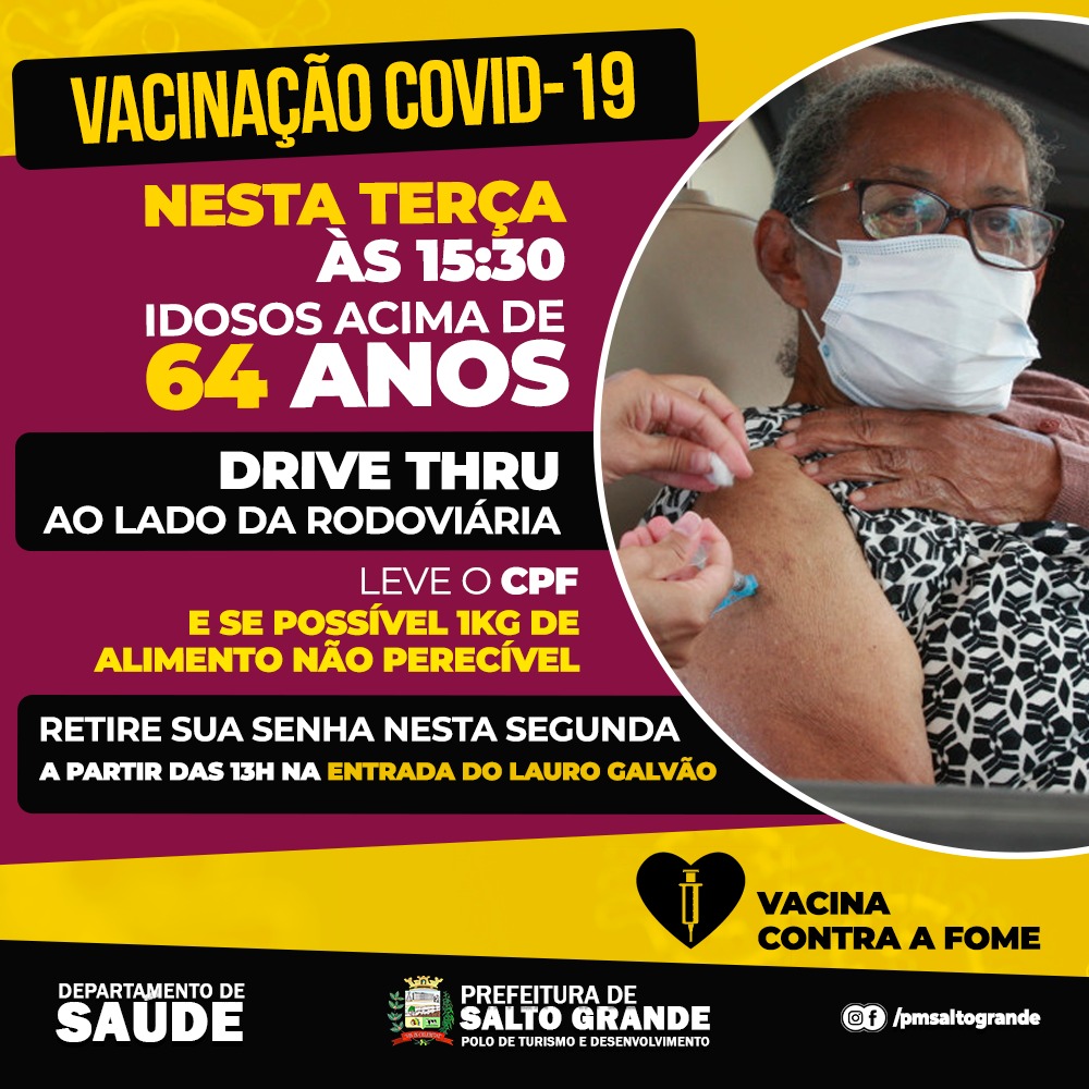 A vacinação será para idosos acima de 64 anos, a partir das 15h30 pelo sistema drive-thru ao lado da rodoviária.