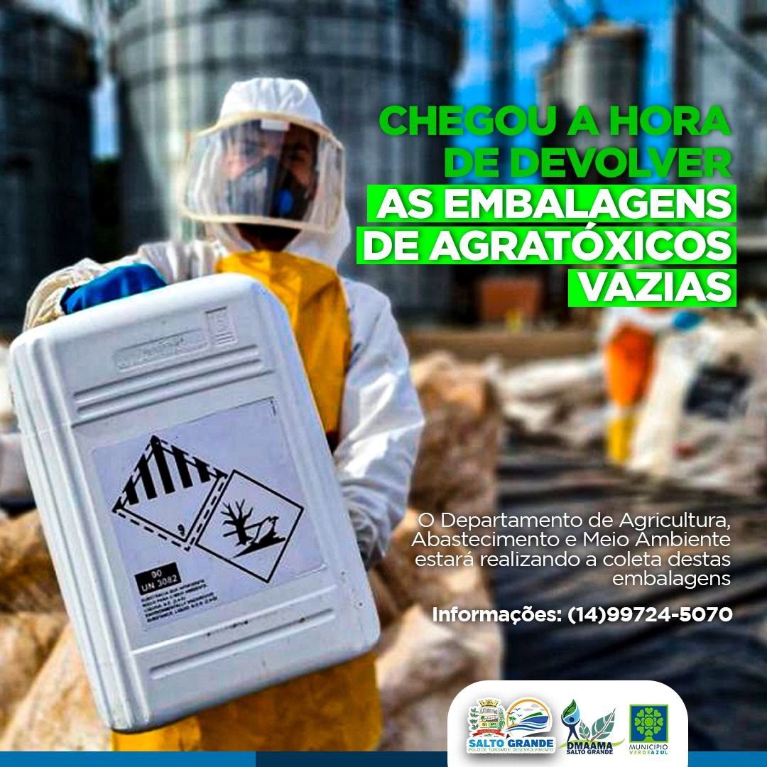 A Prefeitura de Salto Grande, por meio do Departamento de Agricultura, Abastecimento e Meio Ambiente, deu início nesta semana à Campanha de Recolhimento de Embalagens de Agrotóxicos. O objetivo principal da iniciativa é eliminar o risco de contaminação que esse tipo de material representa tanto para o meio ambiente quanto para a saúde dos trabalhadores rurais.