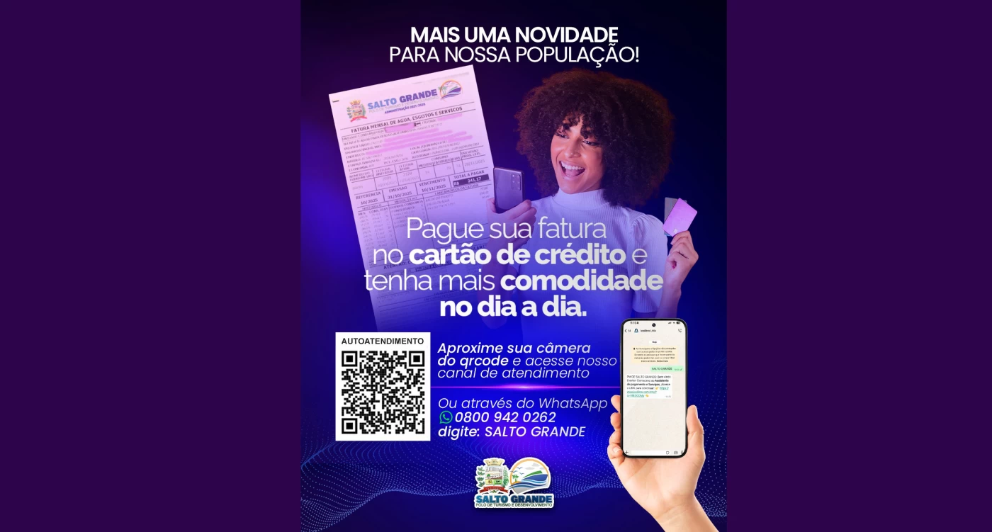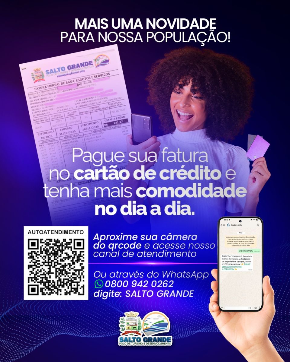 A Prefeitura Municipal de Salto Grande anunciou uma novidade que promete facilitar a vida dos moradores: agora é possível pagar a conta de água com cartão de crédito, de forma rápida, prática e segura.