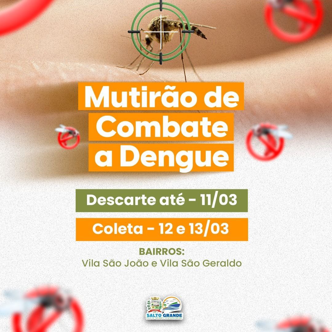 A Prefeitura de Salto Grande está intensificando as ações de combate à dengue, diante do avanço da doença em várias cidades e do risco de transmissão no município. Para isso, será realizado um grande mutirão de limpeza visando eliminar os criadouros do mosquito Aedes aegypti, transmissor da doença.