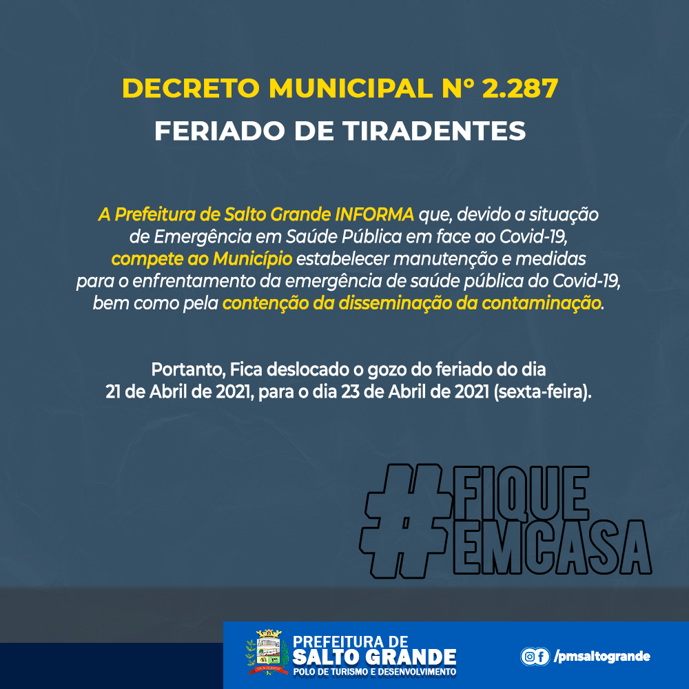 O prefeito de Salto Grande, Mário Rosa (PL), transferiu o feriado do Dia de Tiradentes, dia 21 (quarta-feira), para a próxima sexta-feira, 23. A alteração foi oficializada através do Decreto nº 2.287 e tem como justificativa a situação de emergência estabelecida pela pandemia da Covid-19. Confira: