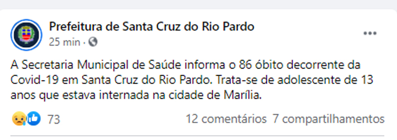 A Prefeitura de Santa Cruz do Rio Pardo informou, através de suas redes sociais, a morte por complicações da Covid de uma adolescente de apenas 13 anos, que estava internada em um hospital de Marília. Esta é 86ª morte naquele município.