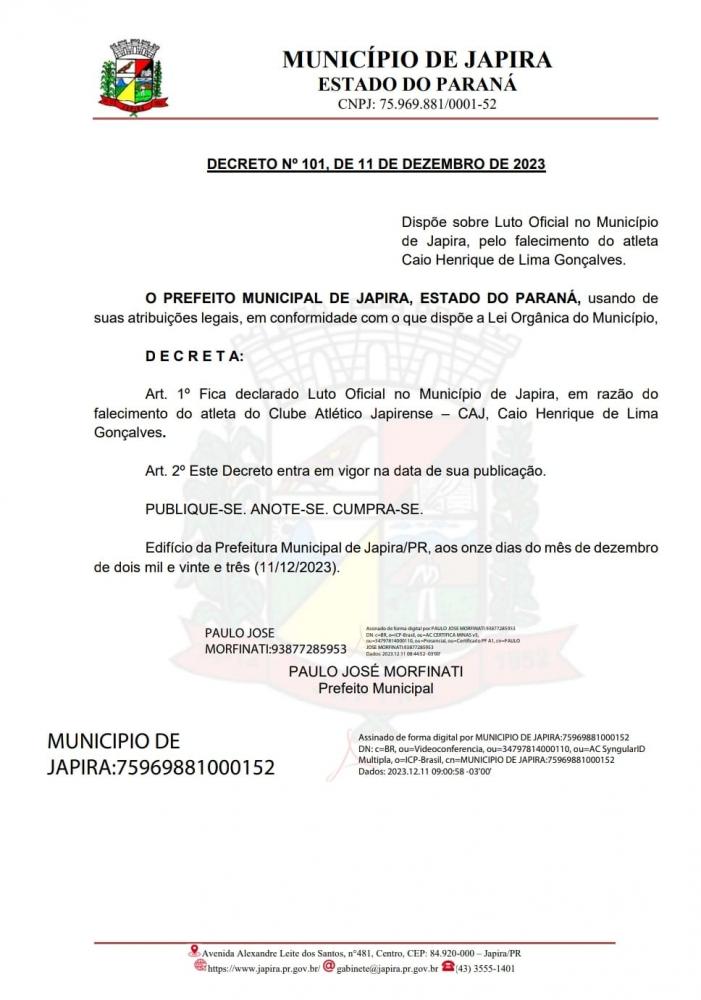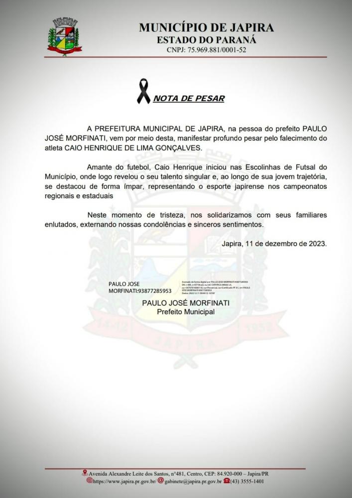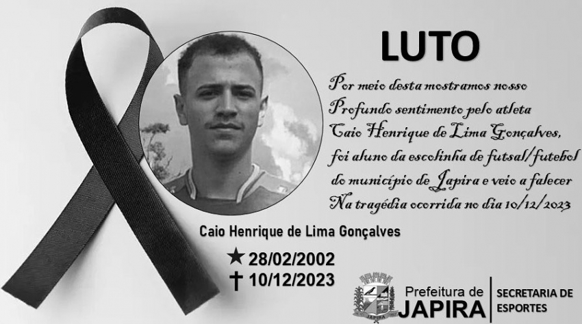 A Prefeitura Municipal de Japira, por meio do Decreto n° 101/2023, decretou Luto Oficial no município em decorrência do trágico falecimento do atleta Caio Henrique de Lima Gonçalves, de apenas 21 anos. A administração municipal emitiu uma Nota de Pesar em solidariedade aos familiares e amigos do jovem esportista, destacando o seu comprometimento em levar o nome de Japira a diversas competições regionais e estaduais, sobretudo na modalidade de futebol.