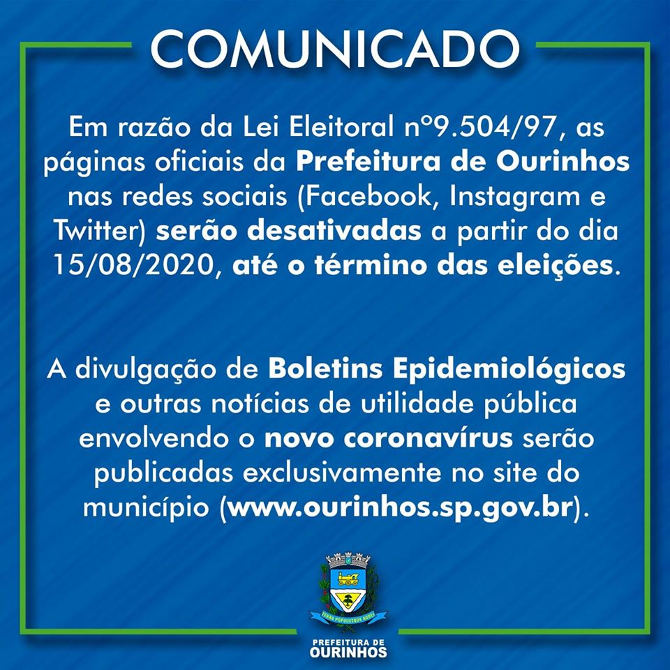 De acordo com a Prefeitura, suas páginas no Facebook, Instagram e Twitter ficarão desativas até o término das eleições, que acontecerão no dia 15 de novembro. Ainda segundo o comunicado, os “Boletins Epidemiológicos”, que são divulgados diariamente com dados da Covid-19, serão postados em seu site oficial: www.ourinhos.sp.gov.br