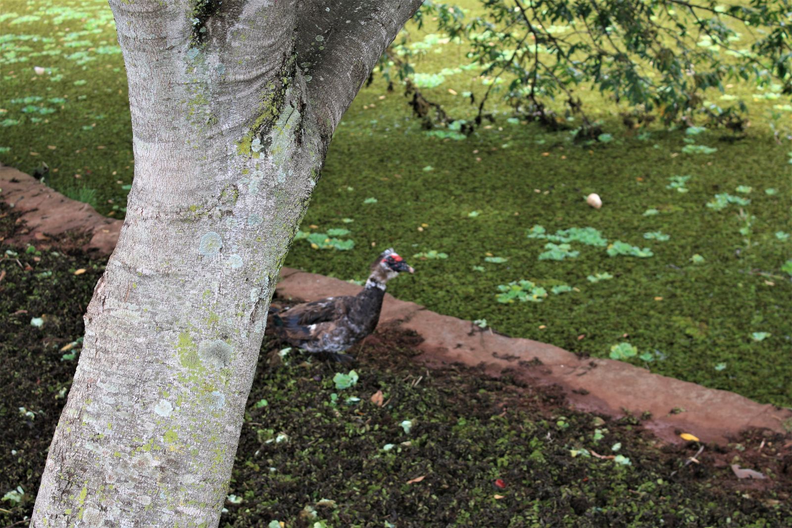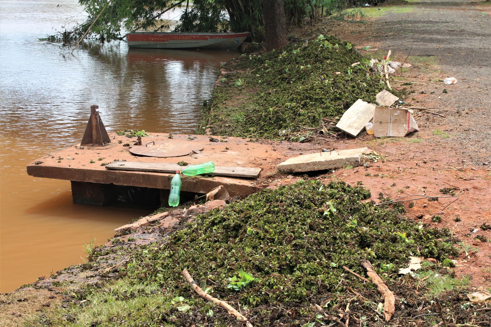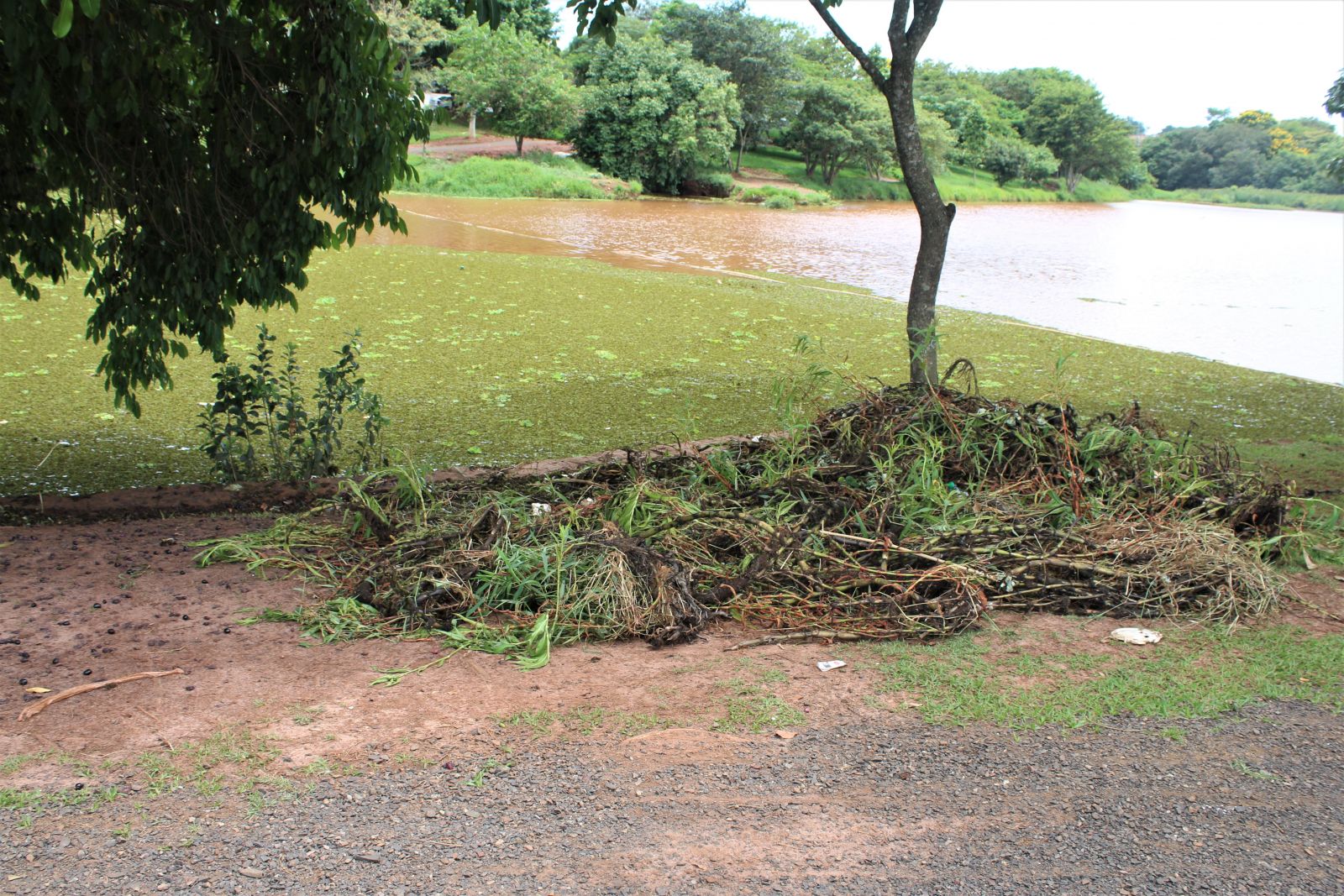 As algas retiradas estão sendo deixadas às margens do lago. Muita sujeira também acaba saindo junto, como garrafas pet (Foto: Laperuta)