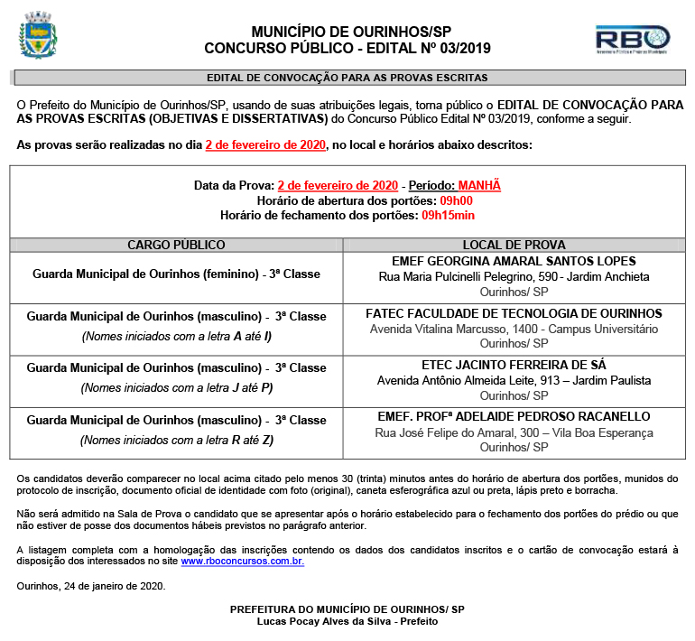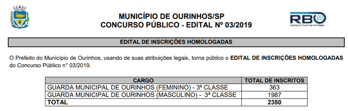 A listagem completa com a homologação das inscrições contendo os dados dos candidatos inscritos e o cartão de convocação estará à disposição dos interessados no site www.rboconcursos.com.br.
