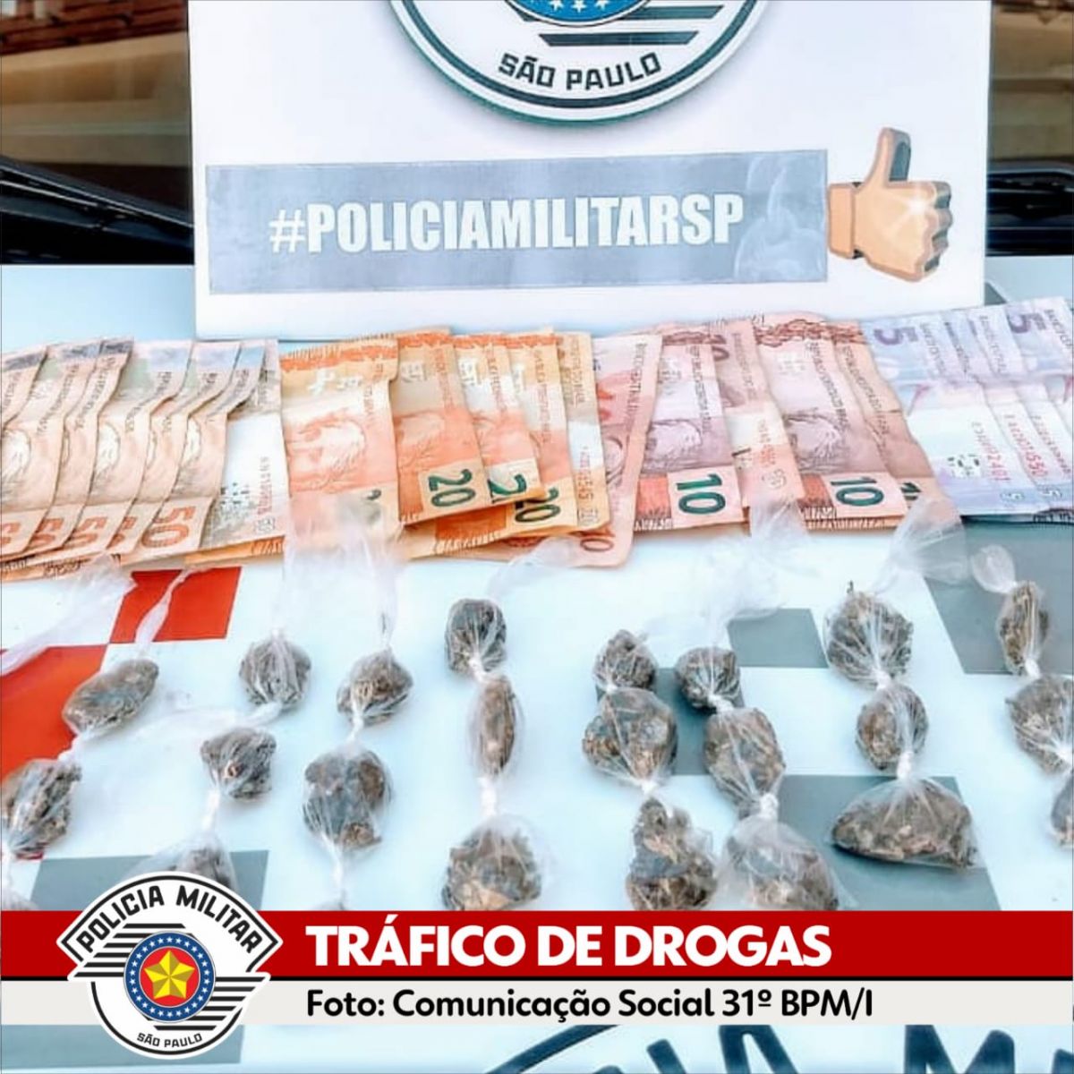 Ato continuo m, foram realizadas buscas na residência do detido e localizou se outras 31 porções de Maconha embaladas e idênticas a que havia dispensado. Na parte externa da casa, foi localizado R$720,00 em moeda corrente, em notas diversas, fruto da traficância.