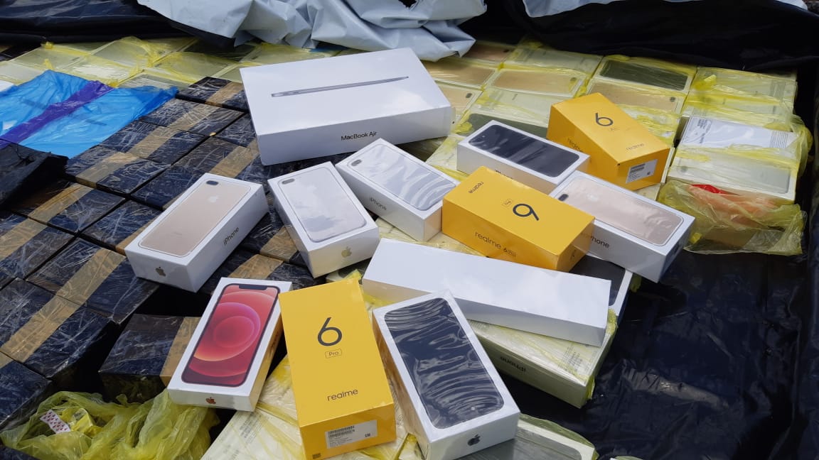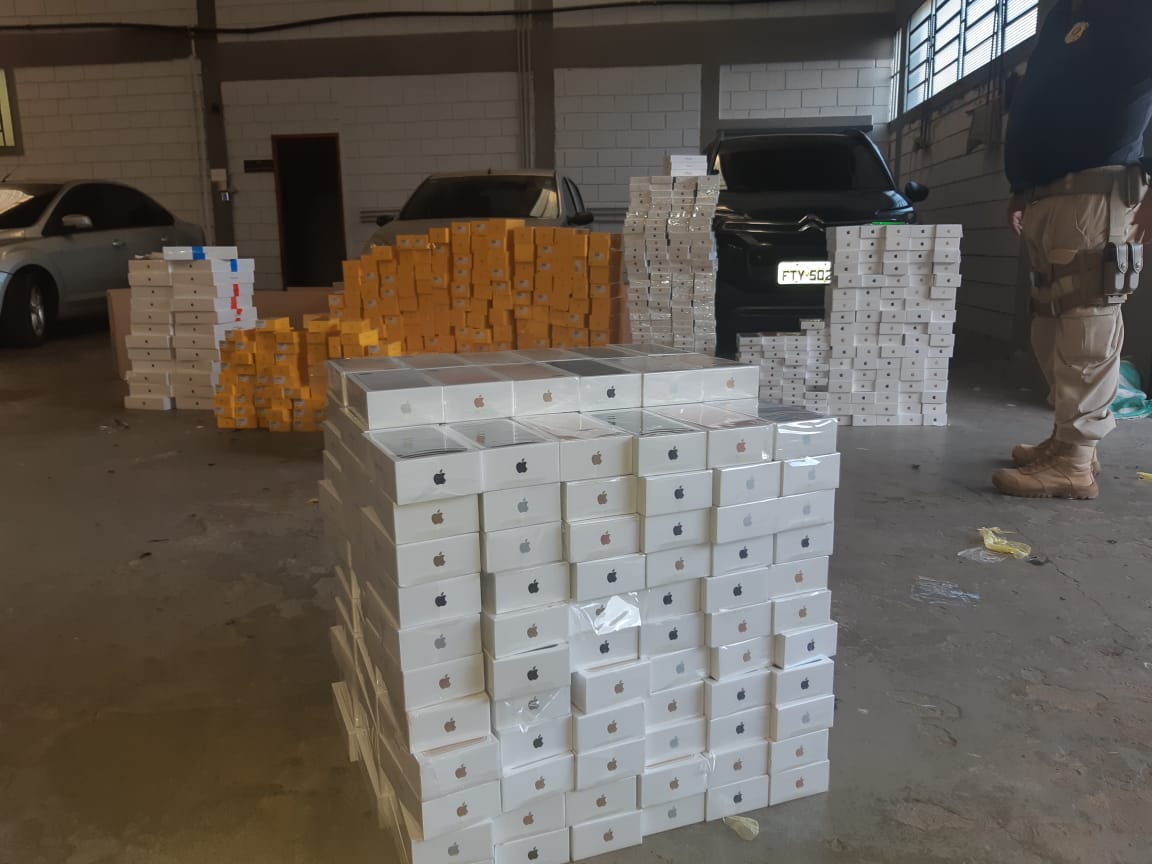 Entre os produtos apreendidos, diversos smartphones e notebooks, Iphones, Macbook, relógios inteligentes da Apple e celulares da marca Redmi.