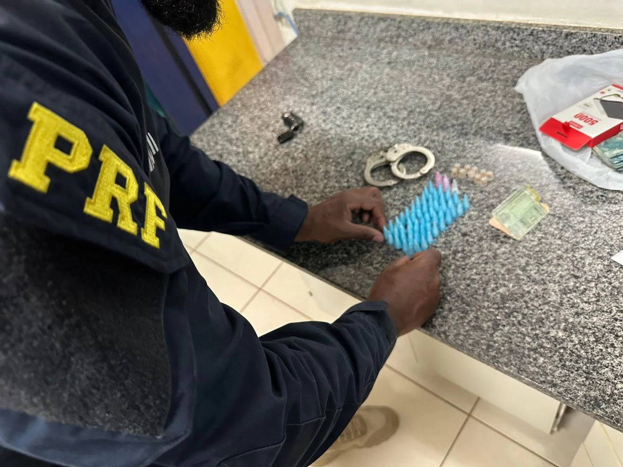 A abordagem ocorreu por volta das 21h15, no km 272 da rodovia, durante uma ronda da PRF. Os policiais suspeitaram do condutor após ele demonstrar nervosismo e inconsistências em sua conversa. Durante a revista, encontraram três pinos de cocaína nos bolsos da bermuda do suspeito. Ao vistoriarem o veículo, localizaram uma sacola plástica e uma caixa pequena contendo o restante das drogas.