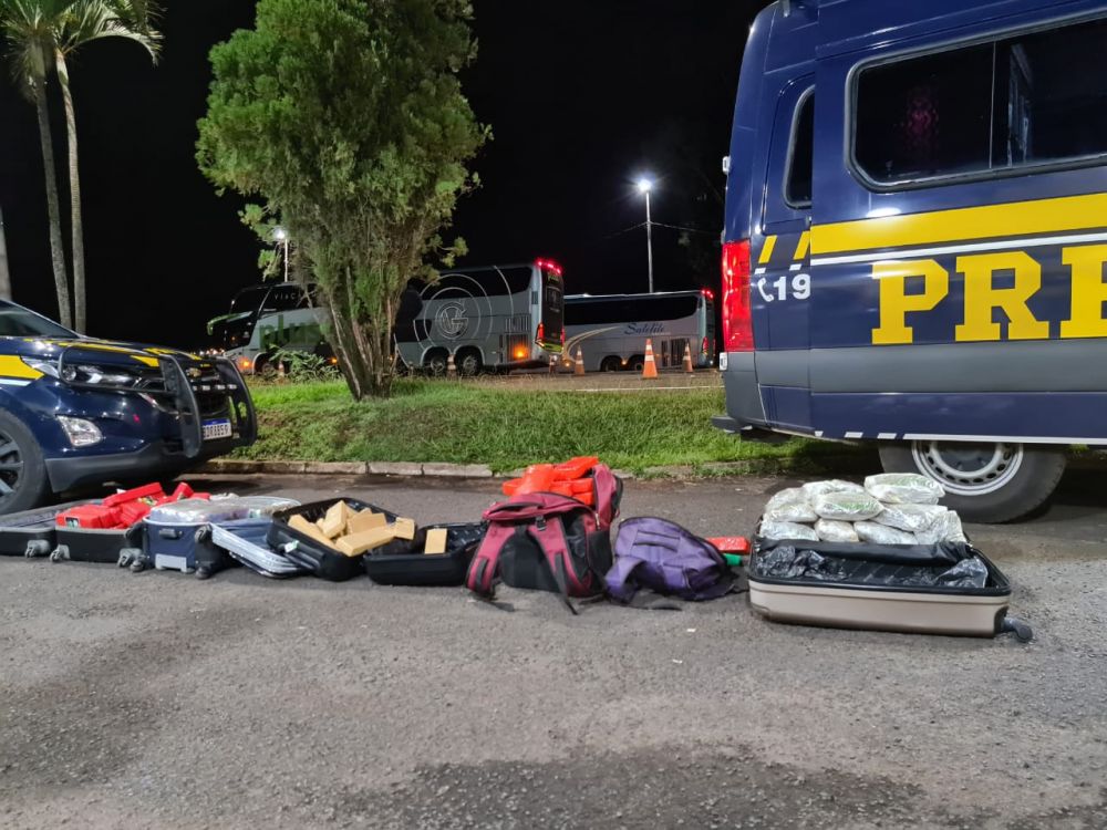 Foram apreendidos nas malas dos passageiros, um total de 85 kg de maconha, 10 kg de skunk e 10g haxixe. Ação contou com o apoio de três cães farejadores, que detectaram as drogas nos bagageiros dos ônibus.