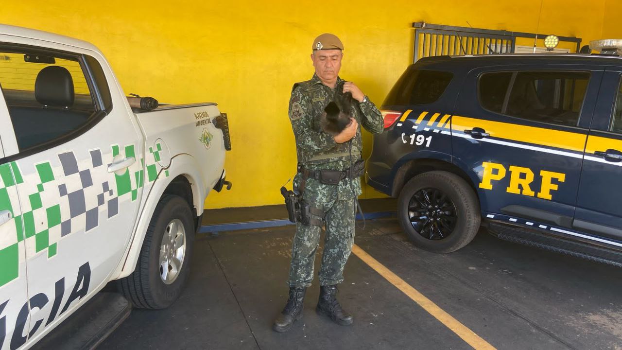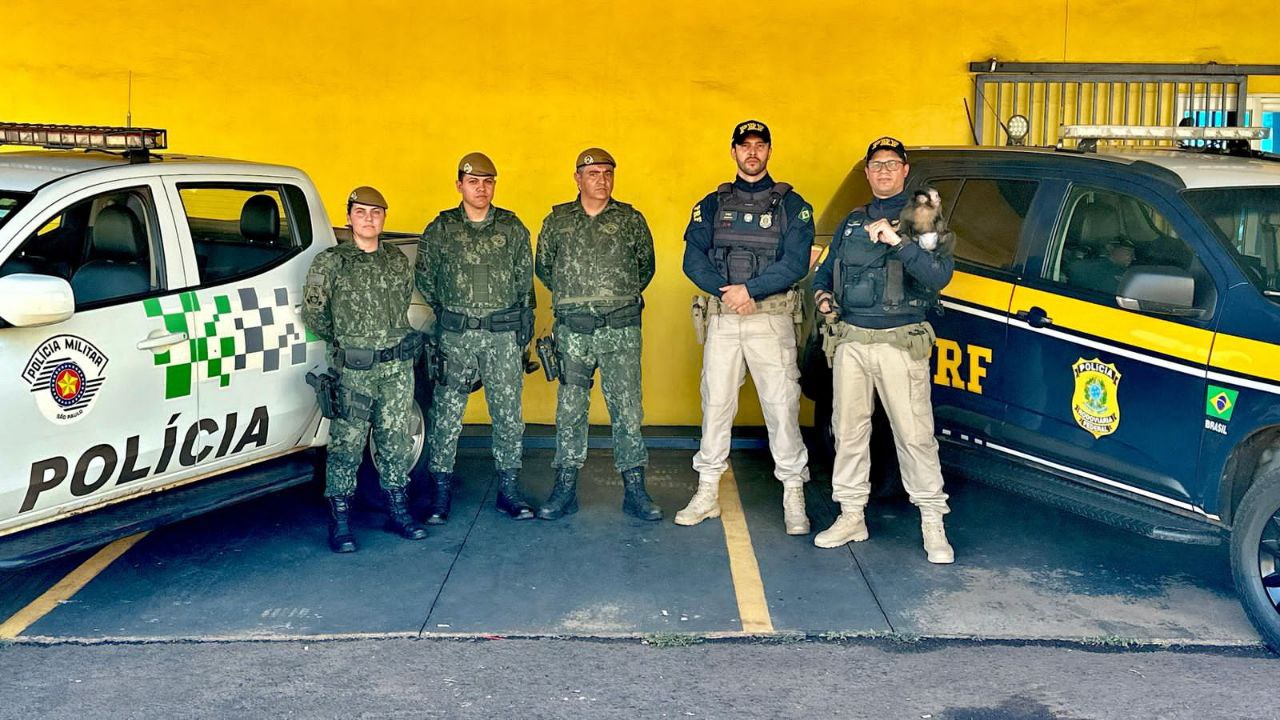 A Polícia Rodoviária Federal (PRF) resgatou, na manhã desta quinta-feira (27), um macaco-prego que estava sendo transportado irregularmente por uma família em uma caminhonete na BR-153, em Ourinhos (SP). Durante a abordagem, uma mulher de 19 anos se apresentou como dona do animal e tentou comprovar a legalidade do transporte com documentos que, após análise, foram identificados como falsos. Ela foi presa em flagrante.