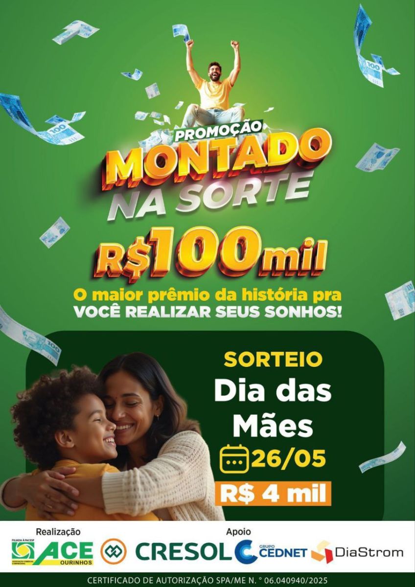 A campanha “Montado na Sorte”, promovida pela Associação Comercial e Empresarial de Ourinhos (ACE), realiza na próxima segunda-feira, 26 de maio, o seu primeiro sorteio, que irá premiar consumidores com R$ 4 mil para serem utilizados exclusivamente nas lojas participantes da promoção.