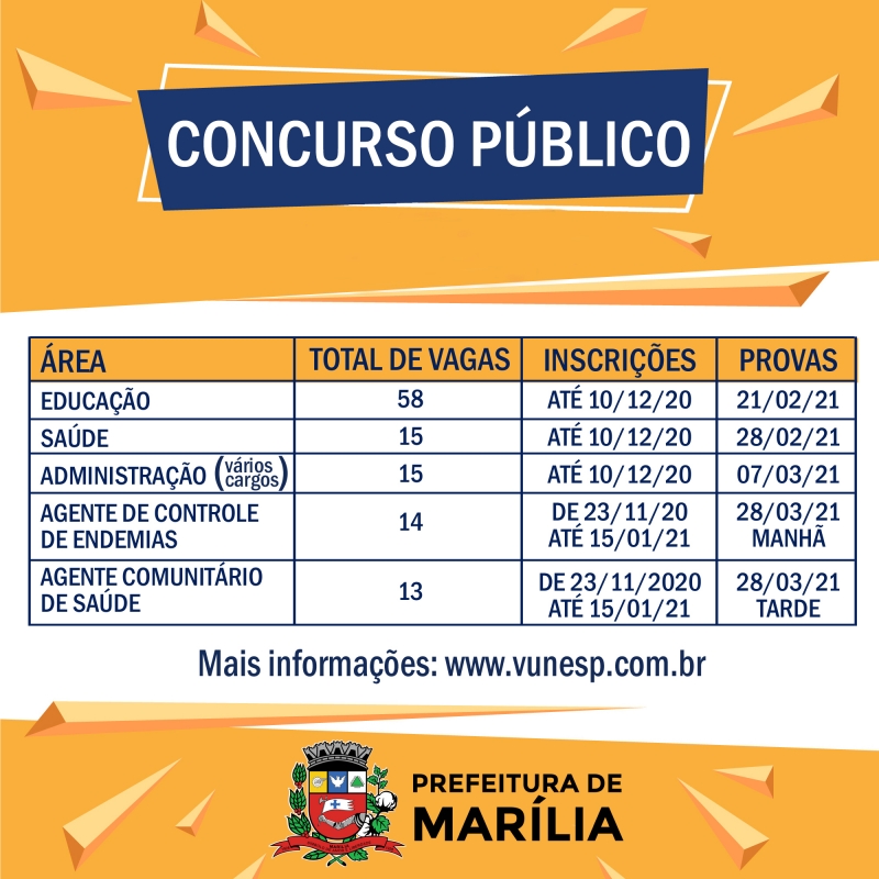 Além disso, as despesas com o concurso correrão por conta da taxa de inscrição, a qual será recebida e administrada diretamente pela Fundação Vunesp, não havendo qualquer arrecadação para a Prefeitura de Marília e, sendo assim, não haverá qualquer despesa para o município.