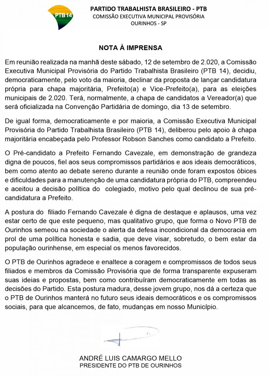 O PTB de Ourinhos emitiu na tarde deste sábado, 12, uma nota informando que desistiu da proposta de lançar candidatura própria para chapa majoritária, Prefeito(a) e Vice-Prefeito(a), para as eleições municipais de 2020. Com isso, Fernando Cavezale deixa a disputa e o partida volta a integrar o grupo de oposição, denominado “Ourinhos por um futuro melhor”: Patriota, PL, PSDB, PSL, PRTB, Solidariedade, Republicanos e Podemos, que deverão apoiar a candidatura a prefeito de Ourinhos, do professor Robson Sanches (Patriota) e Dr. Salim Mattar (PSDB), como vice.