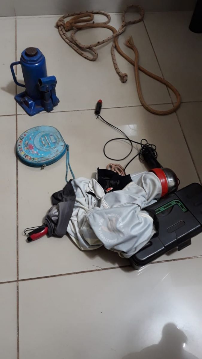 Os indivíduos tentaram empreender fuga a pé, vindo o indivíduo por nome W. L. S. J., de 29 anos, que estava dirigindo o veículo, caiu no chão, foram contidos pela equipe, realizado busca pessoal, nada de ilícito foi encontrado, durante vistoria no veículo, foram encontrados um macaco hidráulico, ferramentas e um porta CD, realizada a identificação dos demais envolvidos, R. de J. G., 18 anos, R. C. de S. C., 18, e C. J. C., 28.