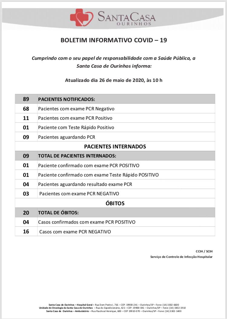 De acordo com o Boletim da Santa Casa divulgado no começo da tarde desta terça-feira, 26, o hospital apresenta uma situação controlada de casos. Com apenas uma pessoa internada confirmada com a doença.