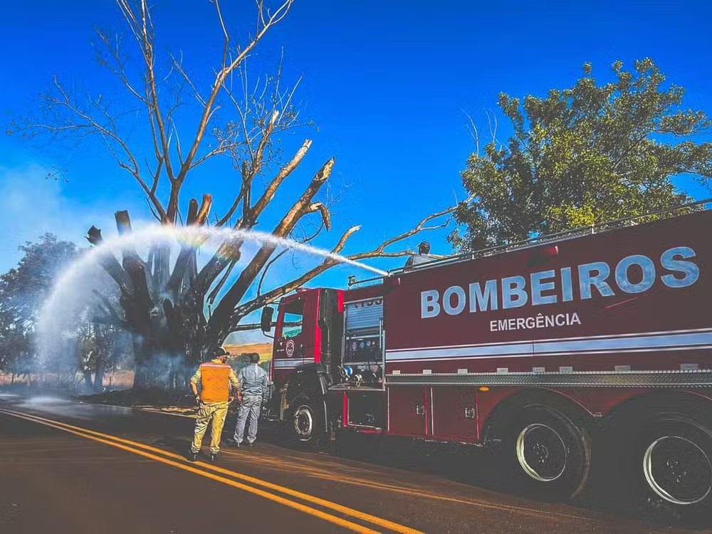 O incêndio, que durou pouco mais de 2h, teve início em uma vegetação rasteira próxima à árvore. Os bombeiros foram acionados e controlaram as chamas.