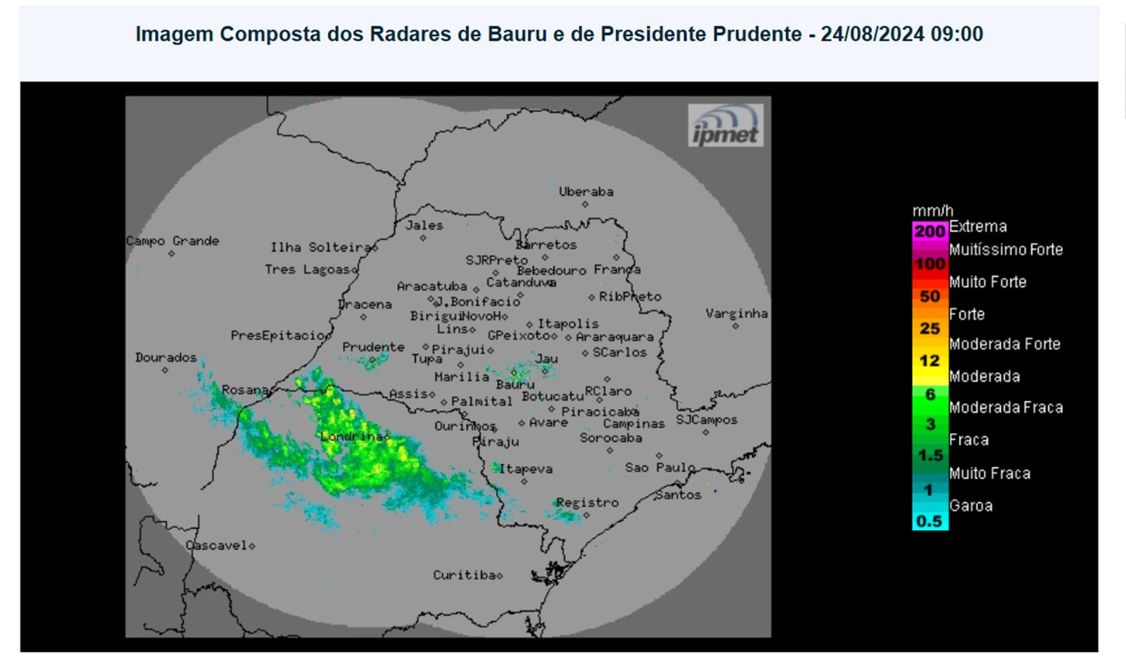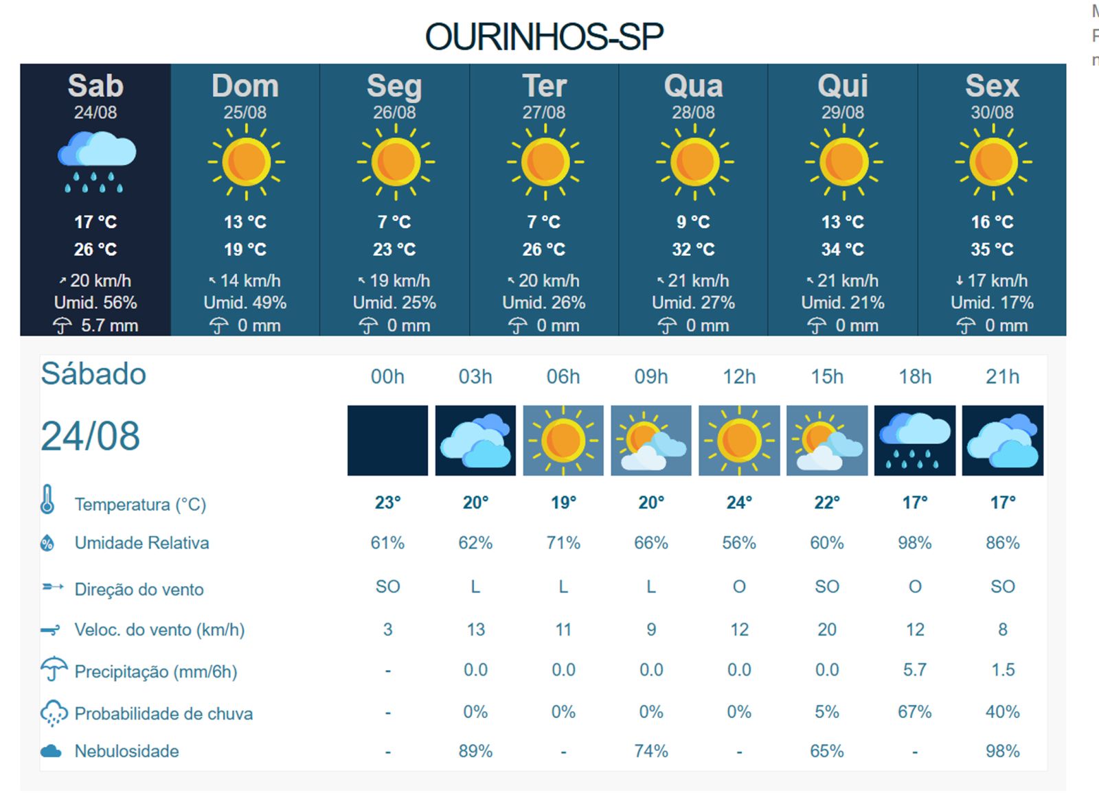 Ourinhos pode ter um sábado chuvoso neste dia 24 de agosto. De acordo com o Climatempo, há previsão de chuva para toda a região. Imagens do radar meteorológico do Ipmet de Bauru indicam nuvens carregadas se movendo do norte do Paraná em direção a Ourinhos. As temperaturas variam entre 17°C e 26°C.
