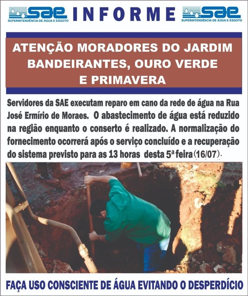 A SAE (Superintendência de Água e Esgoto e Ourinhos) emitiu um comunicado avisando que está consertando um cano da rede de água da Rua José Ermírio de Moraes, no Jardim Ouro Verde.
