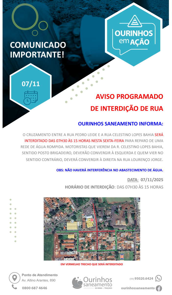 A Ourinhos Saneamento informou que o cruzamento entre a Rua Pedro Leide e a Rua Celestino Lopes Bahia, no bairro Vila São Luiz, ficará interditado nesta sexta-feira (7), entre 7h30 e 15h, para a realização de um reparo em uma rede de água rompida.