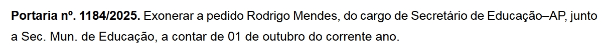 O Diário Oficial desta terça-feira (30) publicou a Portaria nº 1184/2025, que oficializa a exoneração, a pedido, de Rodrigo Mendes do cargo de secretário municipal de Educação de Ourinhos. A saída passa a valer a partir de 1º de outubro.
