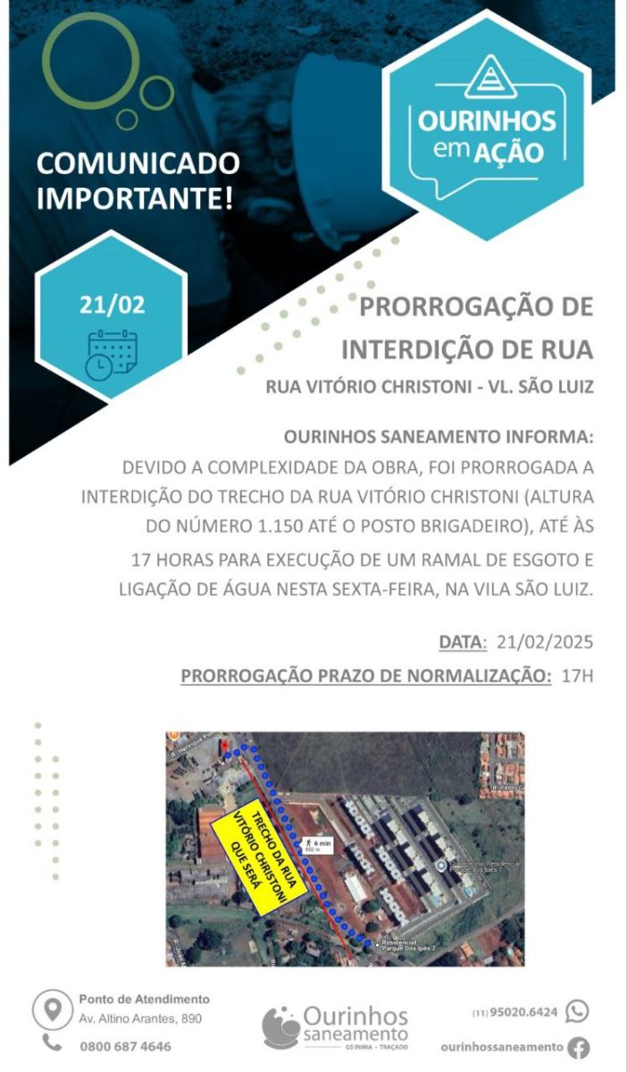 A empresa Ourinhos Saneamento anunciou na manhã desta sexta-feira (21) a interdição parcial da Rua Vitório Christoni, no trecho entre o número 1.500 e o Posto Brigadeiro, na Vila São Luiz, em Ourinhos.