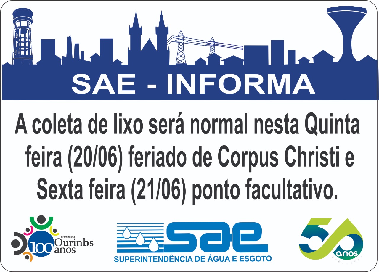 Em comunicado enviado nesta terça-feira, 18, a Superintendência de Água e Esgoto de Ourinhos, a SAE, que é responsável pela coleta de lixo na cidade, informou, que tanto nesta quinta-feira, 20, feriado de Corpus Christi, como na sexta-feira, 21, ponto facultativo municipal, haverá coleta de lixo normalmente. Confira o comunicado: