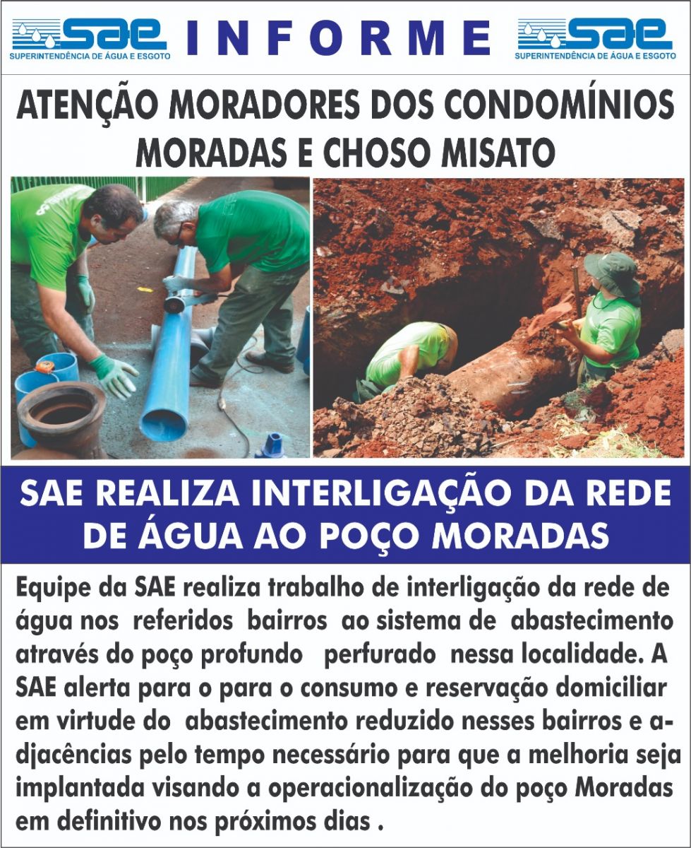 Sem qualquer comunicado prévio, a SAE (Superintendência de Água e Esgoto de Ourinhos) está realizando na manhã desta quarta-feira, 14, uma interligação da rede de água ao novo poço profundo no Condomínio Moradoras, na região do Jardim Itamaraty, em Ourinhos. A manobra deixou sem água os moradores dos condomínios Moradas e Choso Misato. A previsão é que o fornecimento seja restabelecido no final da manhã de hoje (14).