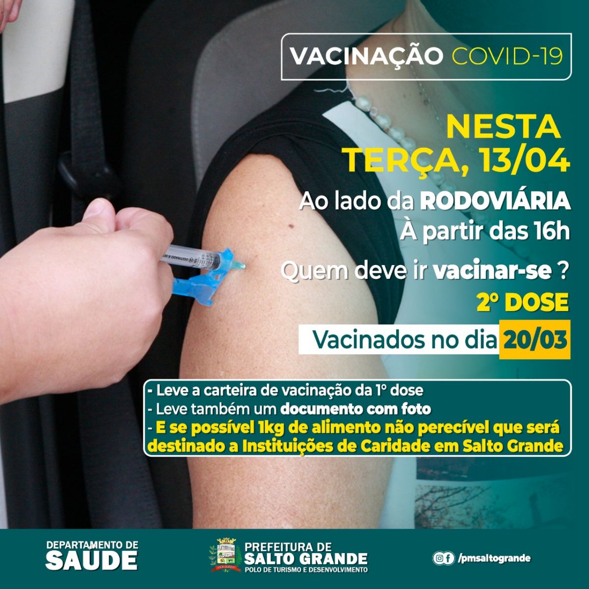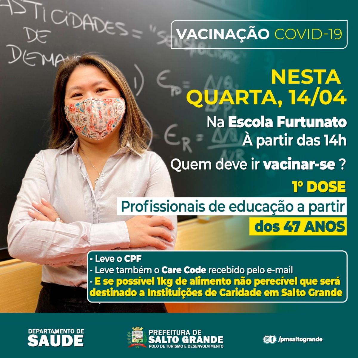 A Prefeitura de Salto Grande em conjunto com o Departamento de Saúde inicia nesta quarta-feira 14/4, a aplicação da 1ª dose da vacina contra a Covid em profissionais da educação acima de 47 anos. A vacinação será a partir das 14h na escola Furtunato. Pedimos encarecidamente a população que utilize máscara de proteção e mantenham a organização conforme serão orientados no local.