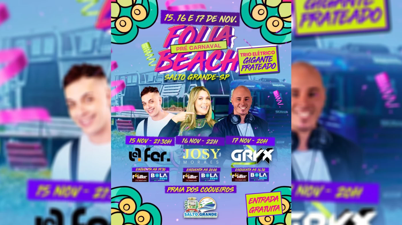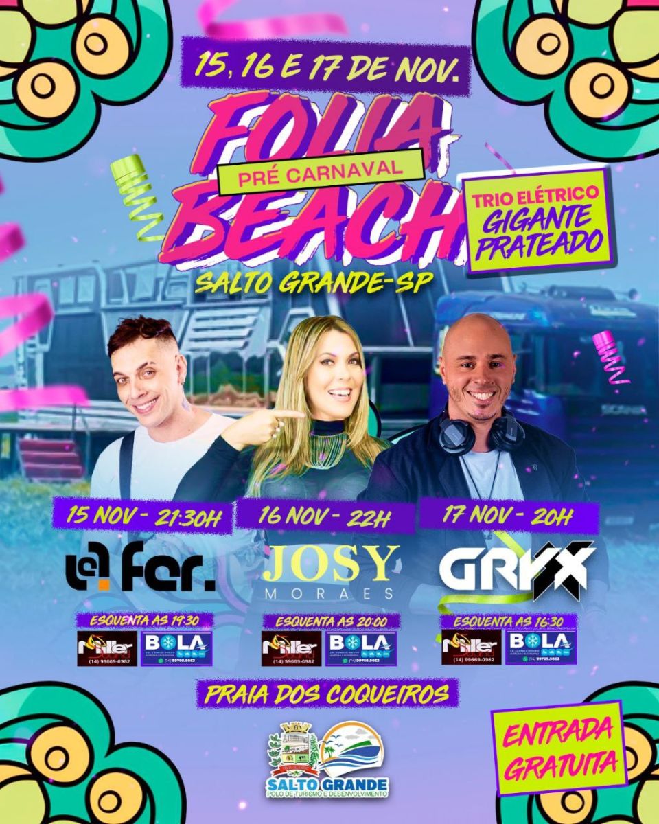 Nos dias 15, 16 e 17 de novembro, a cidade de Salto Grande (SP) será palco do Pré-Carnaval Folia Beach, com três dias de festa gratuita na Praça Francisco Campacci, na Praia dos Coqueiros. O evento, com uma programação cheia de música e animação, promete atrair grande público e consolidar-se como destaque no calendário local.
