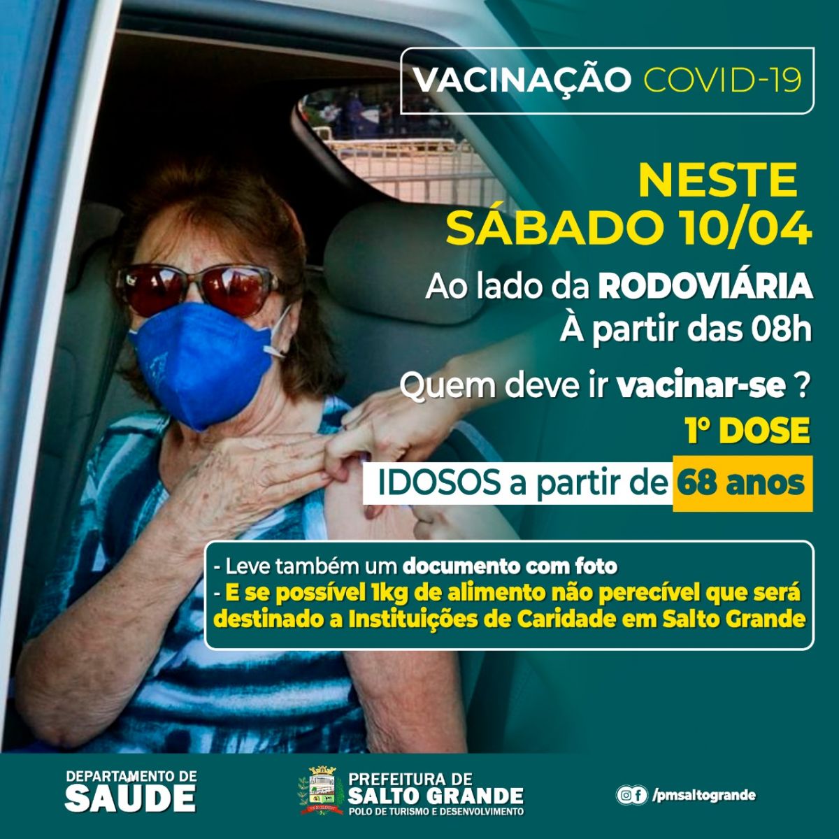 A Prefeitura de Salto Grande retoma a vacinação contra a Covid-19, neste sábado, 10. A vacinação será para idosos acima de 68 anos, a partir das 08h pelo sistema drive-thru ao lado da rodoviária.